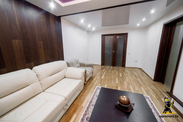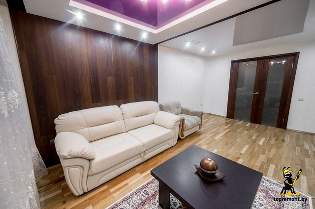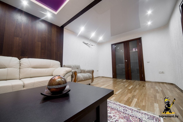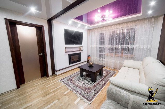 Площадь: 57 м 2. Отделочные работы выполнены по пакету: Дизайнерский. Стиль: Контемпорари, минимализм. Цветовая гамма: Белый, светло-коричневый тёплый пол, тёмно-коричный, кремовый, фиолетовый, оттенки серого. Дизайнер: Сушко Дмитрий. В данный проек